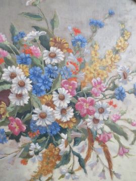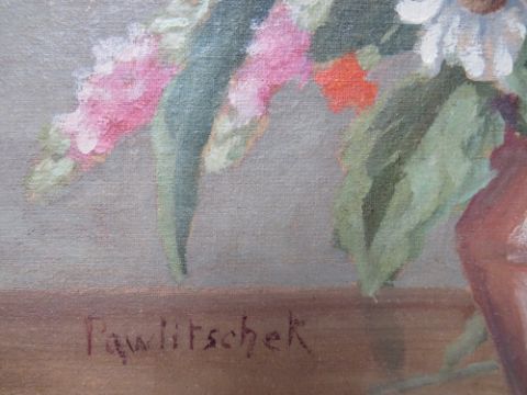 PAWLITSCHEK (XX). Early 20th century circular still life study of flowers in a vase, signed lower left, oil on canvas laid on board, framed, Dia. 49 cm