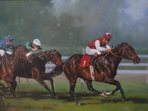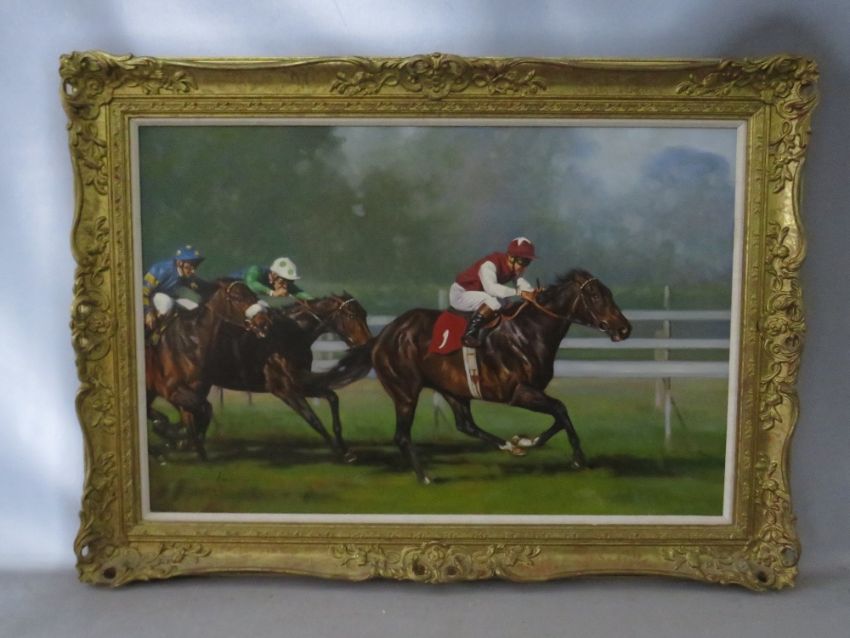 GRAHAM ISOM (b.1945). Horse racing scene 'Dewhurst Stakes', see verso, signed lower left, oil on canvas, framed, 49 x 75 cm