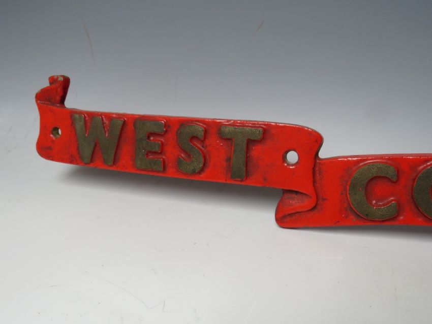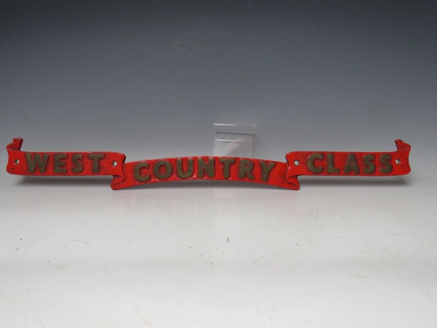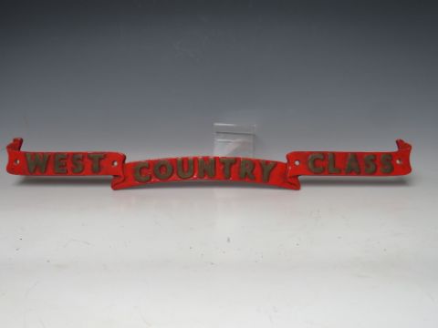 A CAST BRASS REPLICA LOCOMOTIVE RIBBONED NAME PLATE 'WEST COUNTRY CLASS', W 72 cm