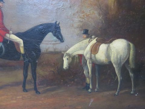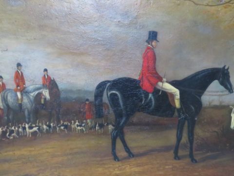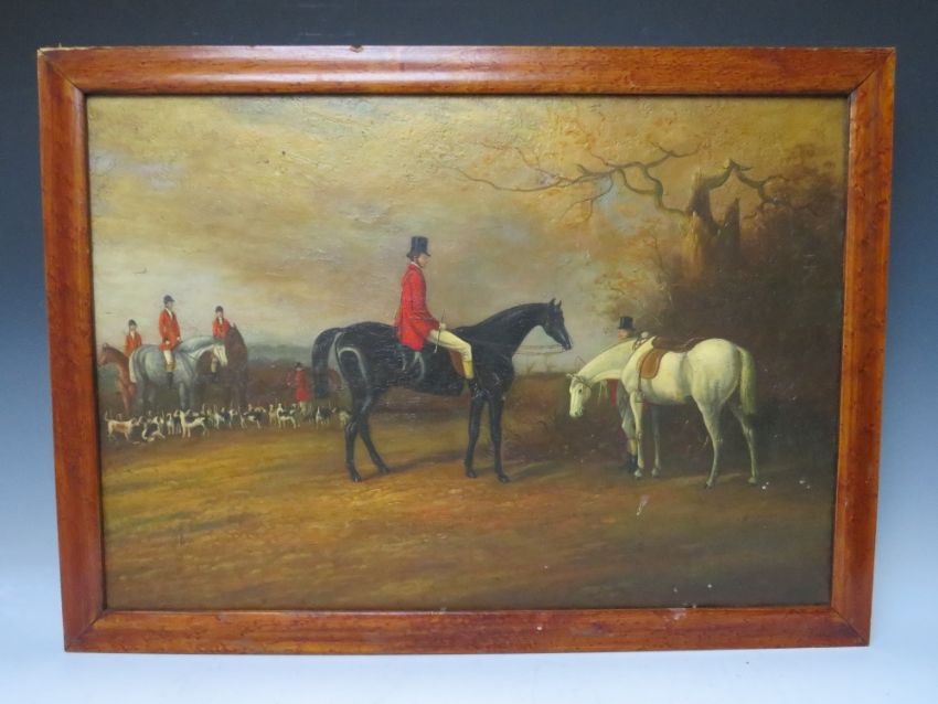 (XIX). A hunting scene with huntsmen, horses and a pack of hounds, unsigned, oil on board, framed, 45 x 66 cm