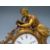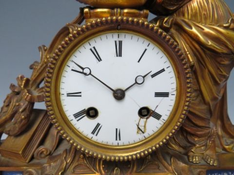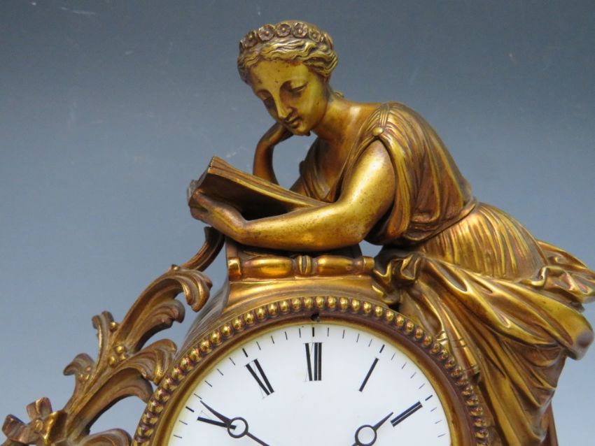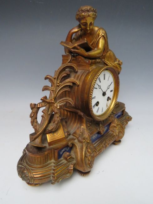 A GILDED BRONZE FEMALE FIGURAL BELL STRIKE MANTLE CLOCK, comprising a neo-classical female draped over the clock head reading a book, the ornate base having various floral swags with inset blue ceramic panels, the S. Marti 8 day movement striking on a slivered bell, H 30 cm, W 36 cm