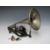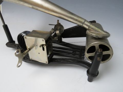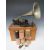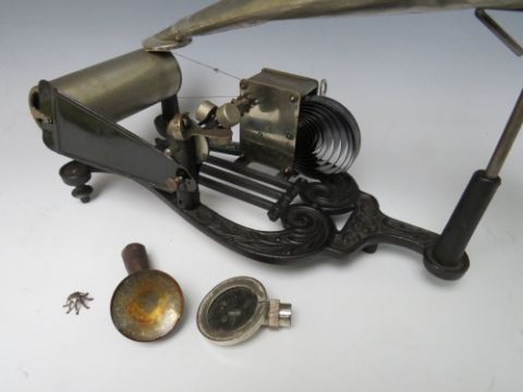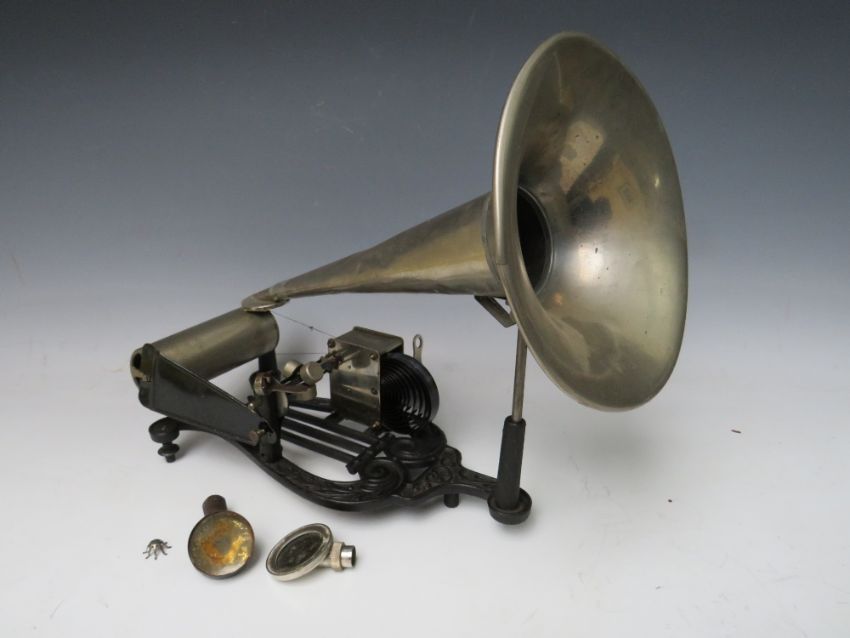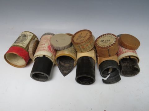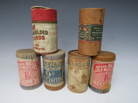 A BOXED PUCK CYLINDER PHONOGRAPH WITH A SELECTION OF WAX CYLINDERS, the cast iron lyre shaped base complete with horn and several diaphragms, six cylinder boxes present containing four wax cylinders, several are damaged