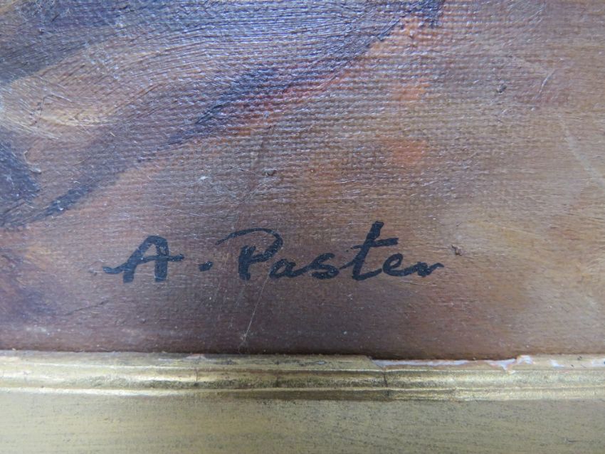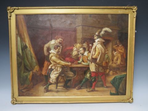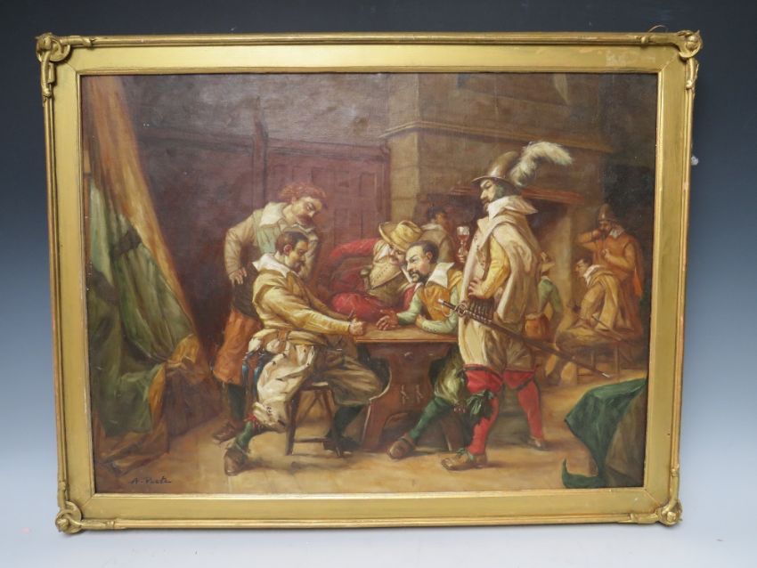A. PASTEN (XIX). Interior scene with soldiers in Carolean dress, signed lower left, oil on canvas laid on board, framed, 43 x 58 cm
