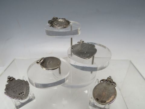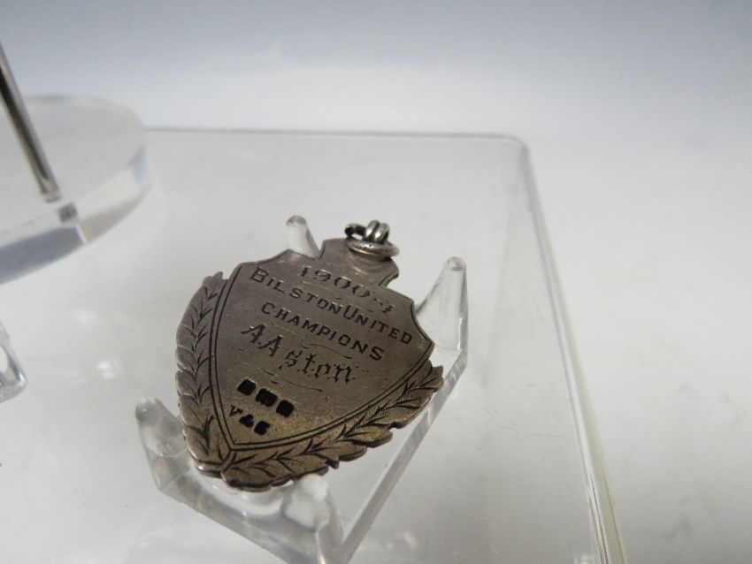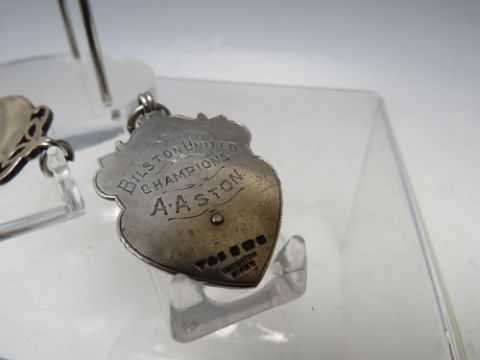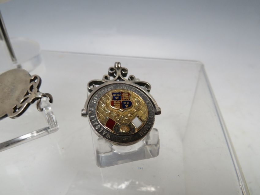 A COLLECTION OF FOUR EARLY 20TH CENTURY HALLMARKED SILVER AND ENAMEL FOOTBALL FOB MEDALS, comprising three examples for Walsall & District Football League plus a Burton & district Football Association example, together with a hallmarked silver swimming fob medal for 1933 (5)