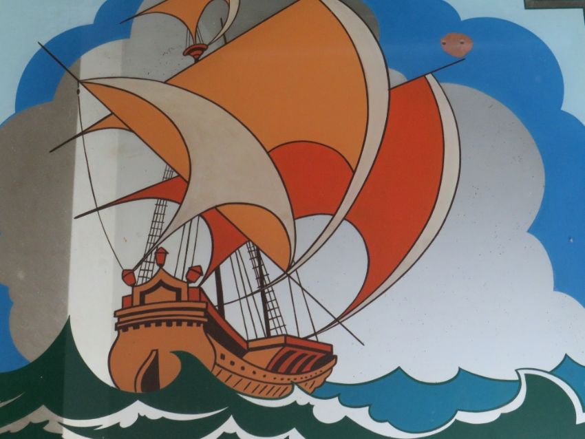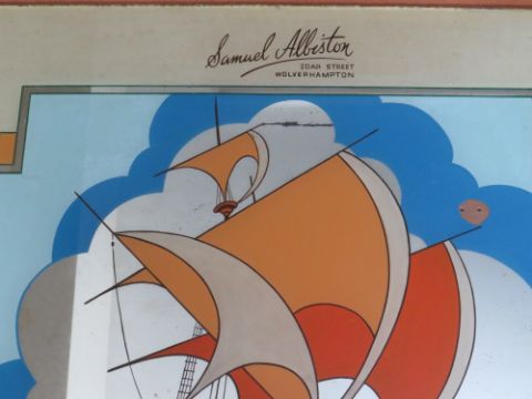 A 20TH CENTURY ADVERTISING COLOURED MIRROR GLASS, for 'Samuel Albiston, Zoar Street, Wolverhampton' depicting a galleon at sea, 81 x 84 cm