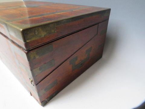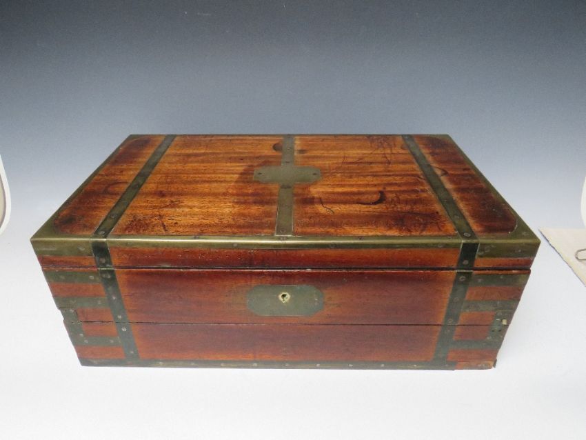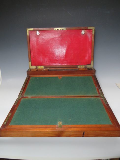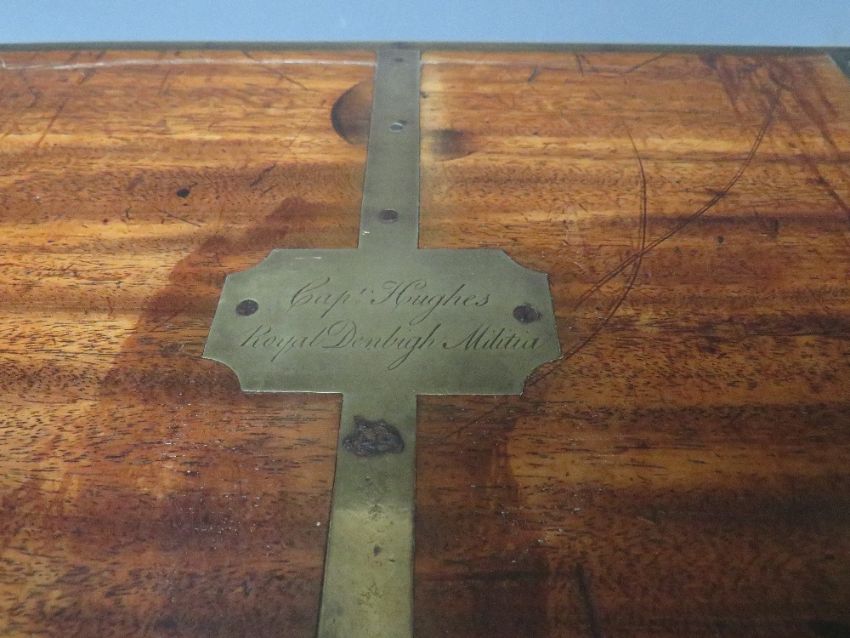 A LARGE 19TH CENTURY MAHOGANY BRASS BOUND CAMPAIGN MILITIA WRITING SLOPE, the hinged lid opening to a fitted interior and fold out writing slope, the top with brass plaque named 'Capt. Hughes Royal Dengbigh Militia', brass bound and inset carry handles, W 50.5 cm