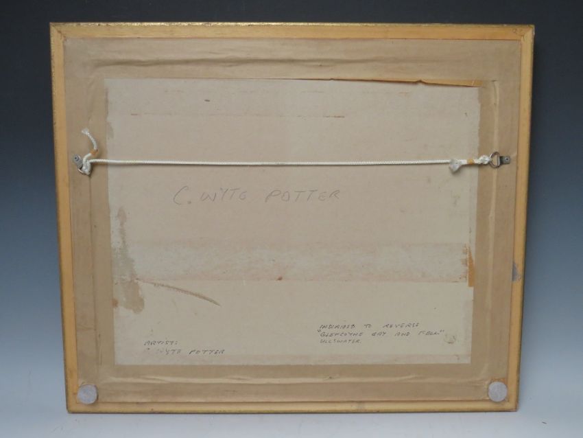 C. WYTE POTTER (b.1905). Stormy lakeland scene with figures, cattle in distance 'Glencoyne Bay & Fell Ullswater' see verso, signed lower left, oil on board, framed, 34 x 44 cm