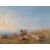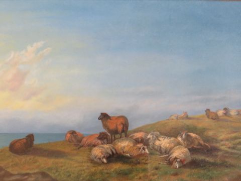 (XIX). A coastal landscape with figures and sheep on cliff top pasture, unsigned, oil on canvas, framed and glazed, 37 x 74 cm
