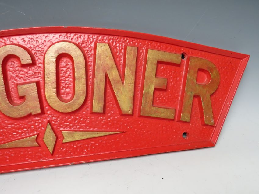 AN ARCHED WOODEN LOCOMOTIVE FOUNDRY CASTING MOULD NAME PLATE 'WAGGONER', painted red and gold, the rear is worded 'W.D. 92 HUNSLET 3792 BUILT 1953', W 74 cm, H 23 cm