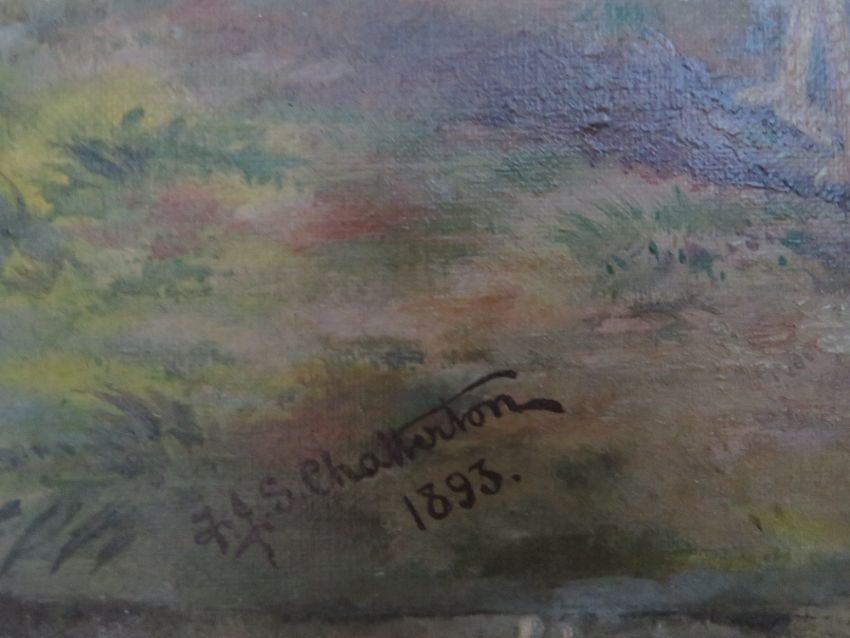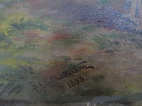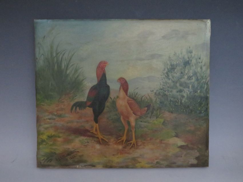 F.J.S. CHATTERTON. A study of two fighting cocks in a wooded landscape, signed and dated 1893 lower left, oil on canvas, unframed, 30 x 35 cm