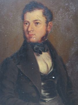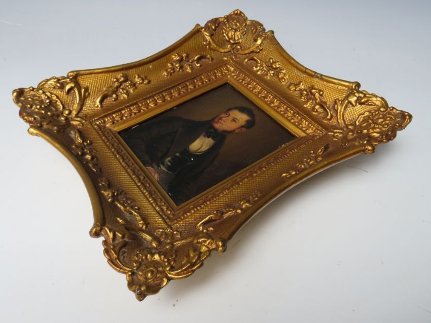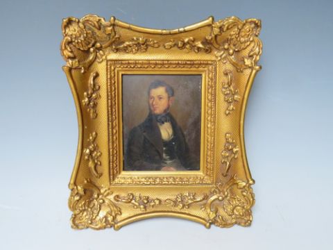 A 19TH CENTURY MINIATURE HALF LENGTH PORTRAIT STUDY OF A GENTLEMAN, unsigned, oil on board, framed, 12 x 9.5 cm