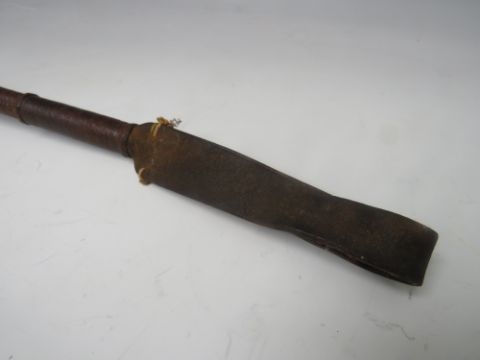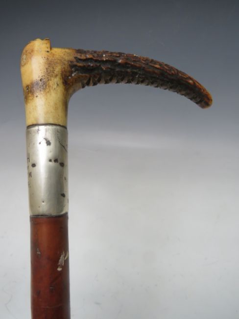 A VINTAGE SILVER COLLARED RIDING CROP WITH BONE / HORN HANDLE, L 76 cm