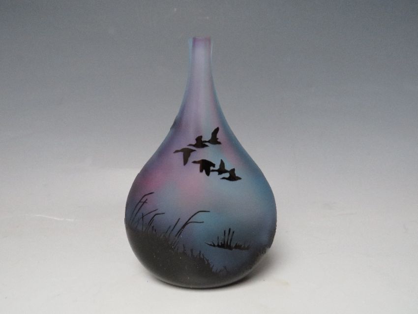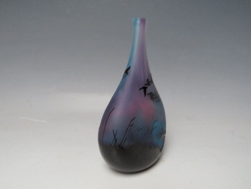 AN ED BURKE E & M STUDIO GLASS SCENIC VASE, black cased, being acid etched to reveal a blue and purple tonal ground with countryside scene and ducks in flight, engraved marks, H 14.5 cm