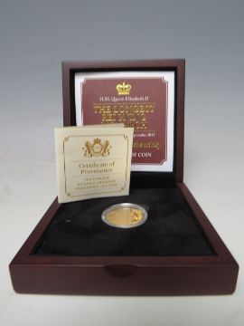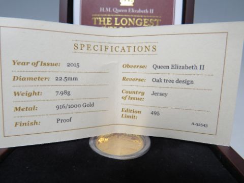 JERSEY 2015 GOLD £1 PROOF COIN 'THE LONGEST REIGNING MONARCH', with certificate and wooden presentation box