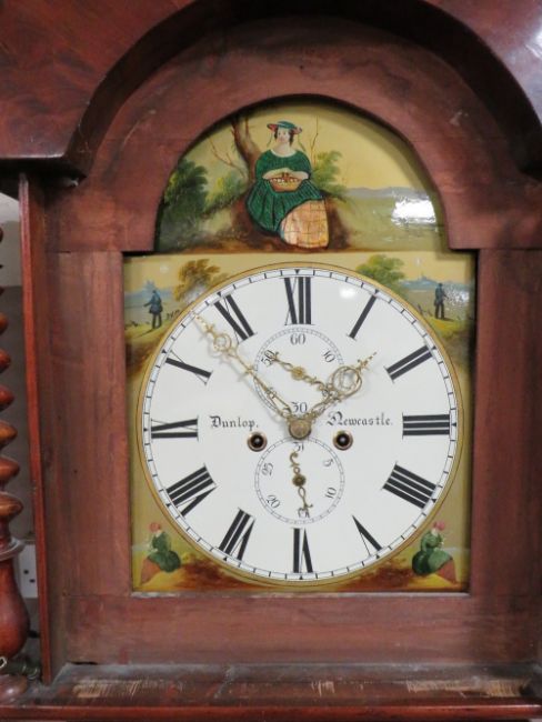 A LARGE 19TH CENTURY 8 DAY MAHOGANY LONGCASE CLOCK BY DUNLOP - NEWCASTLE, the arched painted dial having subsidiary seconds and date dials, twin weights and pendulum, H 228 cm
