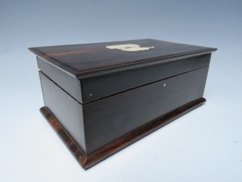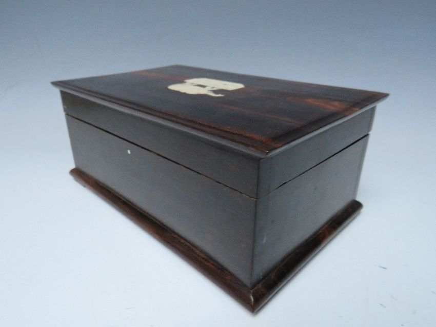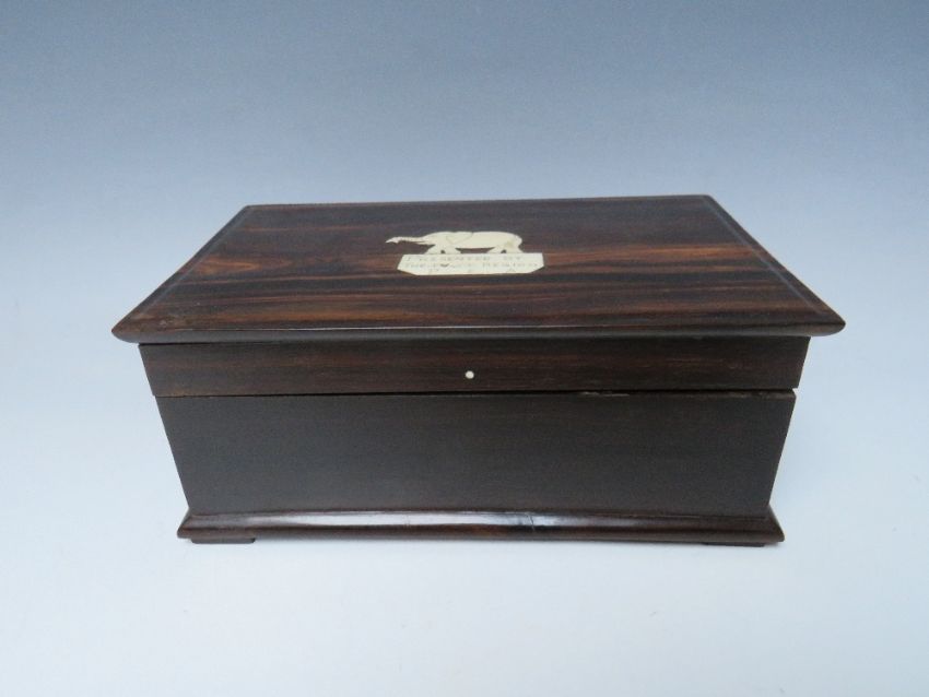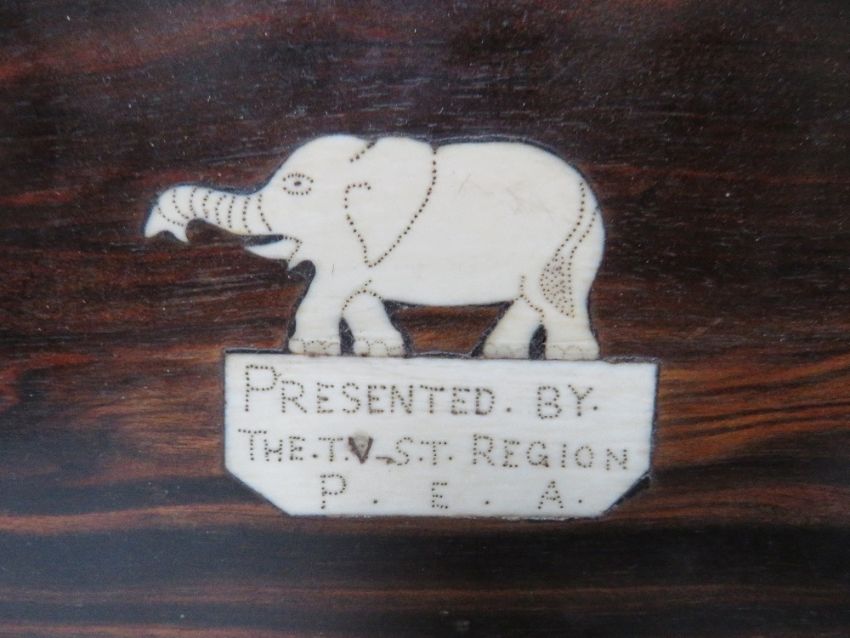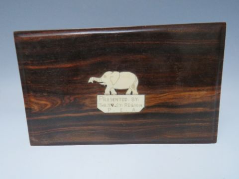 A COROMANDEL WOODEN LIDDED BOX, having bone inlay detail to lid depicting an elephant, dedication reads 'Presented By The TV - ST Region P E A, , W 22 cm, D 13 cm, H 9.5 cm