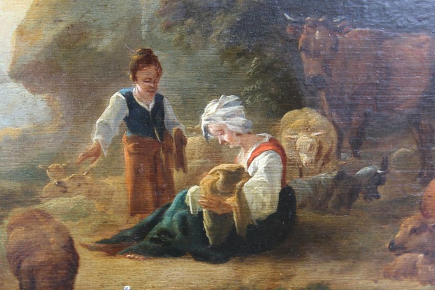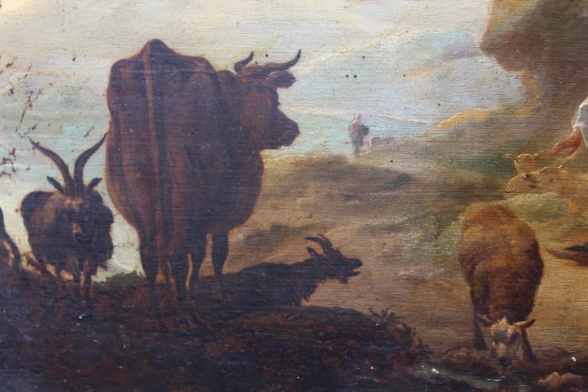 WILLEM ROMEYN (HAARLEM 1624 - c.1694). A shepherdess with her herd in a landscape, oil on panel, unframed, 40.5 x 55.8 cm