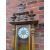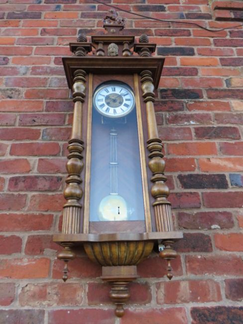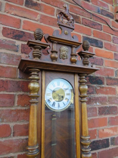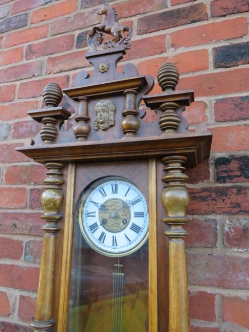 A LARGE GONG STRIKE VIENNA WALL CLOCK, the tall case comprising of oak pillars, mahogany veneered front, beehive finials and rearing horse crown, the paper dial with Roman numeral and repouse inner dial, H 148 cm, S/DEscapement rocker strip detached and sellotaped to door