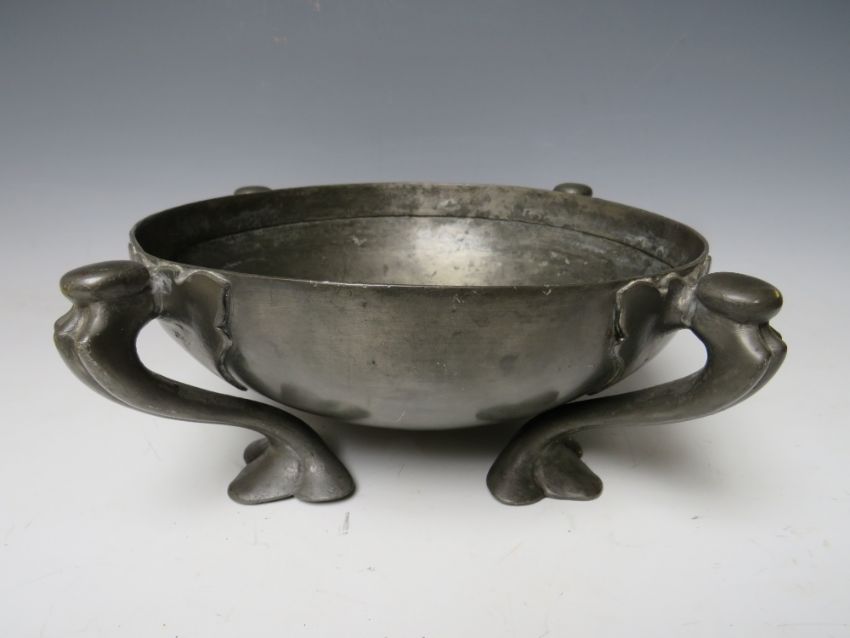 A LARGE ART NOUVEAU LIBERTY STYLE PEWTER BOWL, raised on four out swept feet, unsigned, Dia. 26 cm, H 10 cm, overall W 33 cm