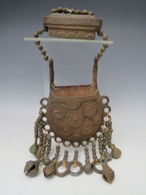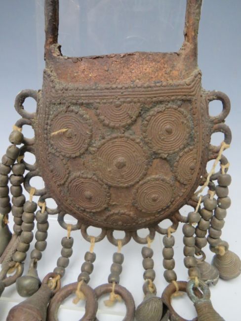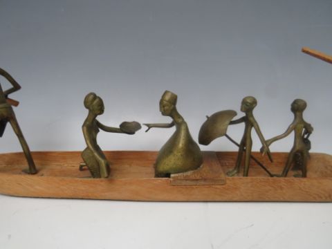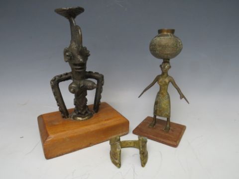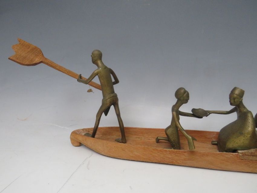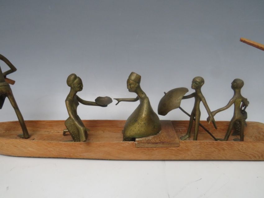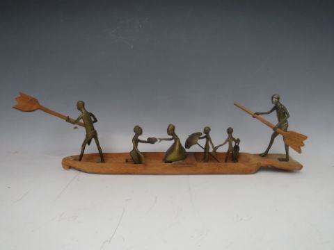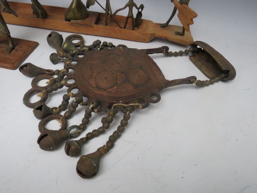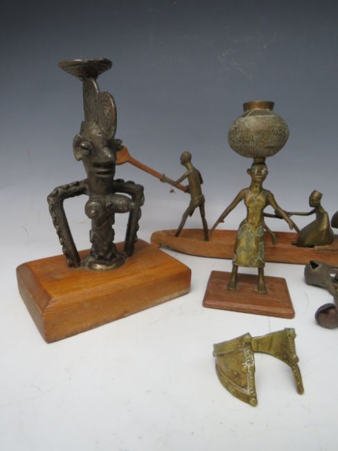 A COLLECTION OF AFRICAN TRIBAL METAL FIGURES ETC. to include a lady carrying water, various figures in a boat etc., together with and unusual metal purse etc (5)