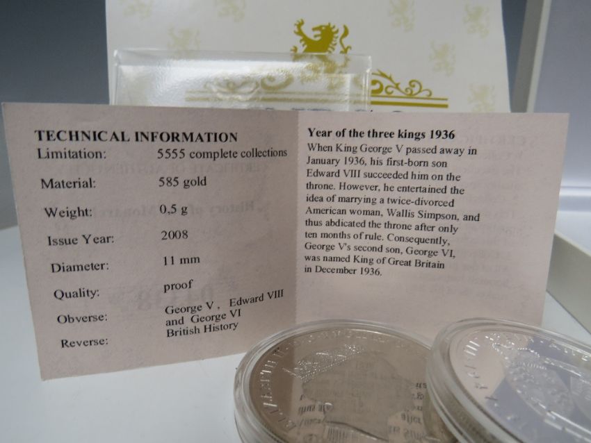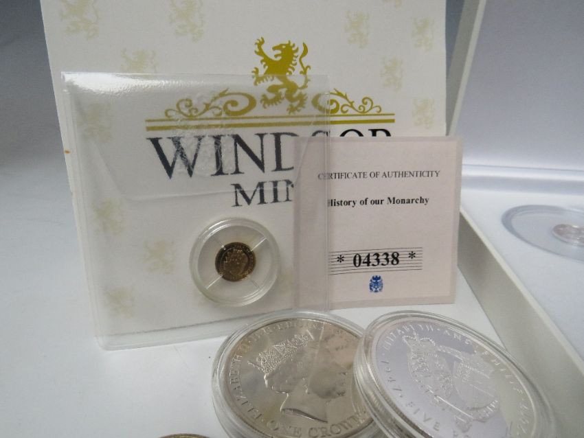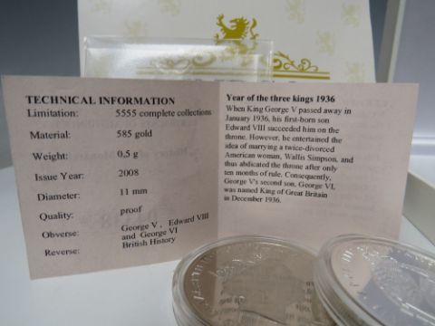 A PROOF ELIZABETH II 2008 THE YEAR OF THREE KINGS GOLD COIN IN A CAPSULE, with certificate stating approx. 0.5 g, together with cased set of five 2019 white metal Queen Elizabeth II Gibraltar currency - the outer case marked Forever the First Silver Sovereign, an Alderney 2017 Elizabeth and Phillip 1947 - 2017 £5 coin in capsule, a Gibraltar 2017 one crown coin in capsule together with a collection of loose 20th century coinage