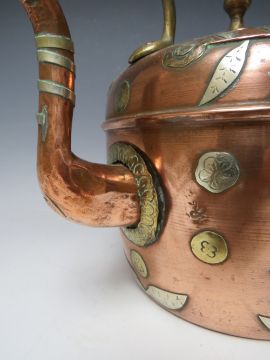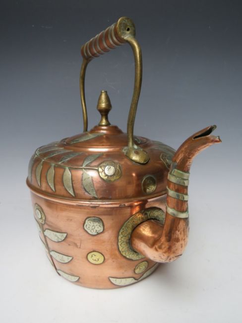 A 19TH CENTURY COPPER KETTLE WITH WHITE METAL INLAY, H 28 cm