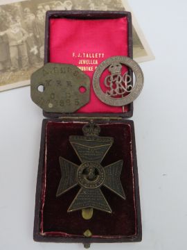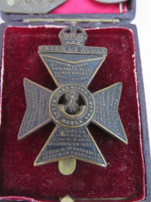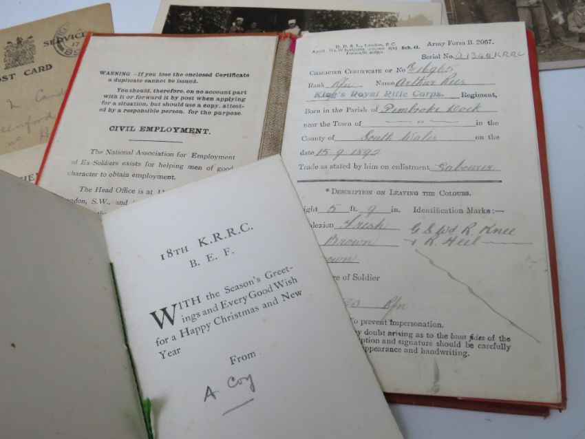 A WORLD WAR 1 PAIR NAMED TO PTE. ARTHUR REES - KINGS ROYAL RIFLE CORPS, to include original dog tag, photographs, cap badges and service book