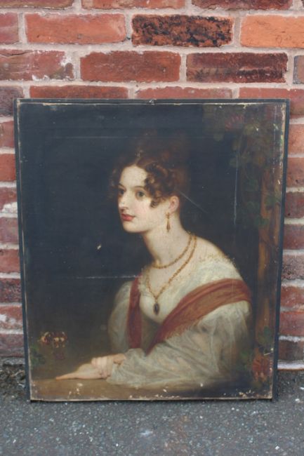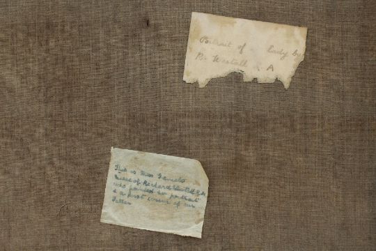 CIRCLE OF RICHARD WESTALL R.A. (1765-1836). Portrait of a lady in a white dress with red shawl, possibly Miss Daniels, half- length, oil on canvas, unframed, bearing labels verso, 76 x 63 cm