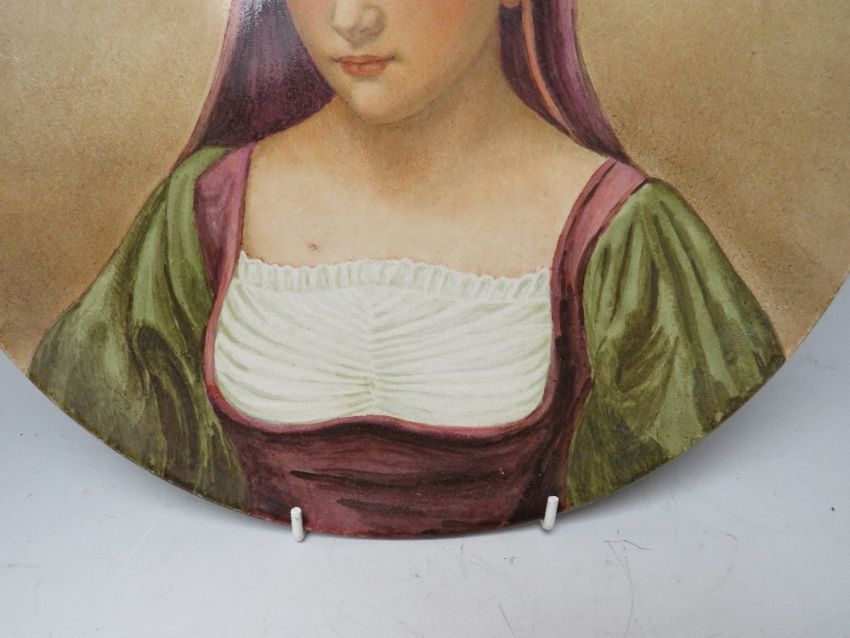 A PINDER BOURNE & Co CHARGER DEPICTING A LADY IN A HOODED ROBE, with impressed marks to the reverse and dated 1882, also monogrammed, 'M I P ', Dia. 31 cm