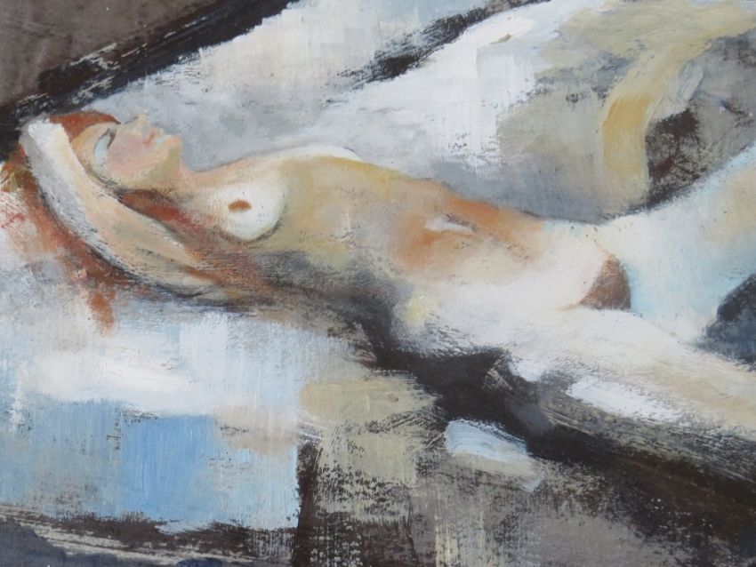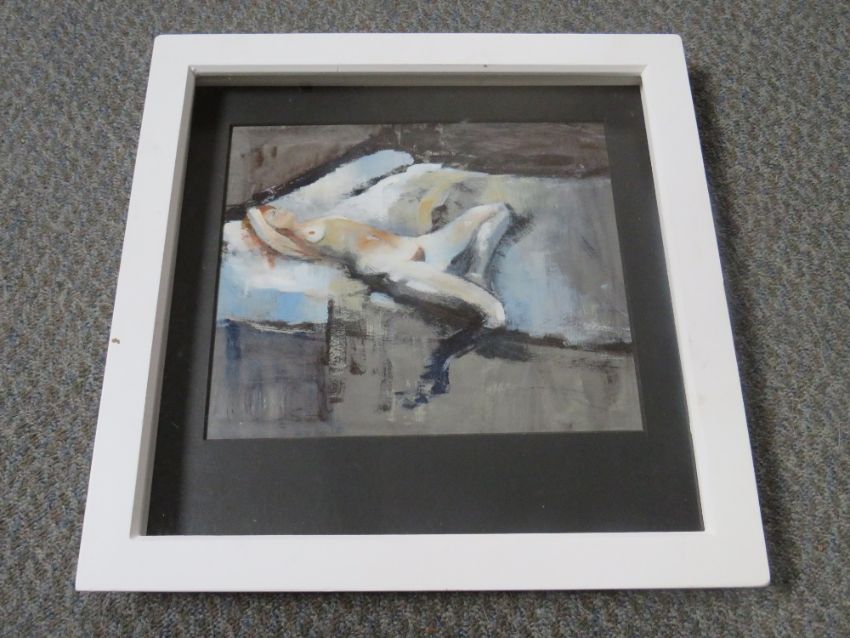 MICHAEL SMITH (XX). English school, female nude reclining on a bed, signed lower left, oil on board, framed and glazed, 21 x 24 cm