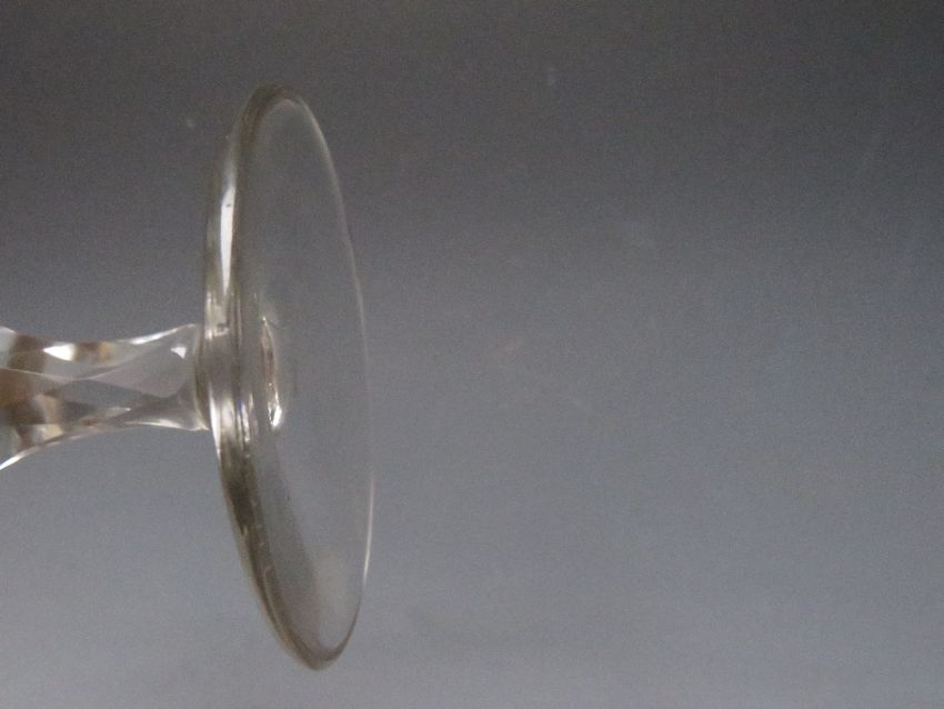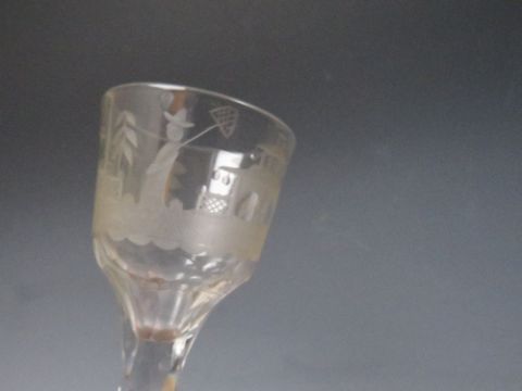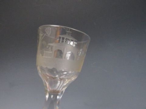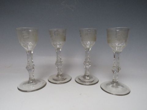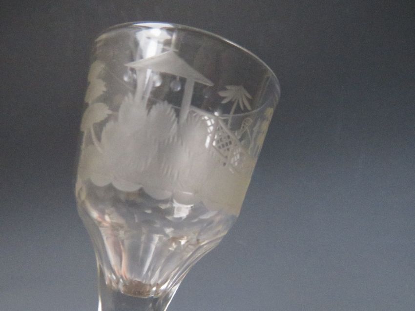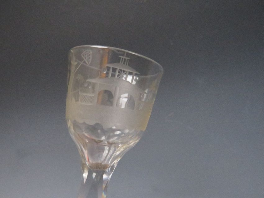 A SET OF FOUR LATE 18TH CENTURY GEORGIAN WINE GLASSES, each having bowl engraved with Oriental and figurative detail and pagodas, raised on faceted stems and conical feet, H 15.3 cm (4)