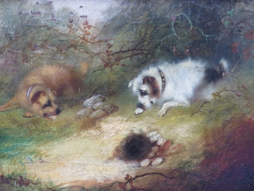 FRANK CASSELL (XIX). British school, terriers at a rabbit hole, signed lower middle to right, oil on canvas laid on board, framed, 19 x 25 cm