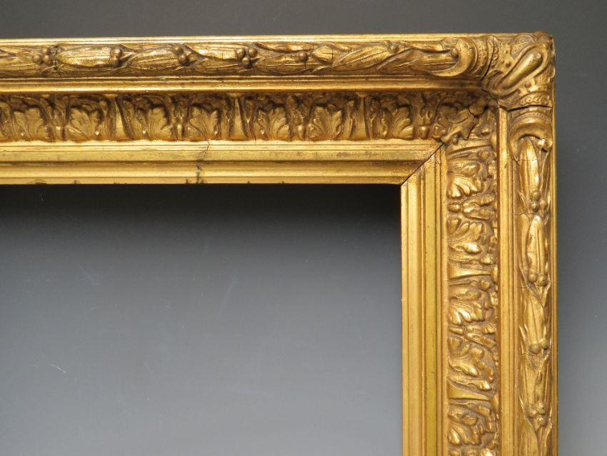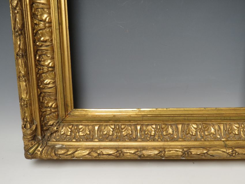 A 19TH CENTURY GOLD FRAME WITH LEAF DESIGN TO INNER EDGE, and acanthus leaf design to outer edge, frame W 9 cm, rebate 36 x 31 cm