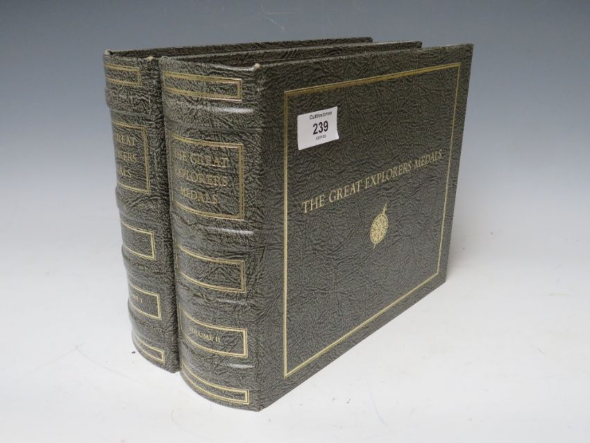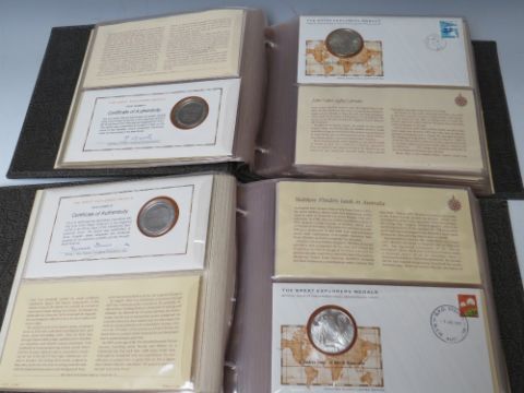 THE GREAT EXPLORERS LIMITED EDITION STERLING SILVER MEDALS CONSISTING OF FIFTY FIRST DAY COVER STYLE PRESENTATIONS OVER TWO EMBOSSED BOUND VOLUMES