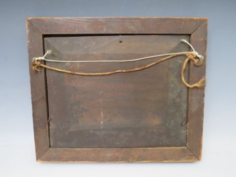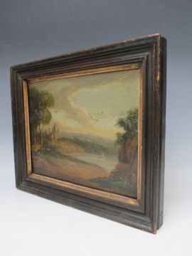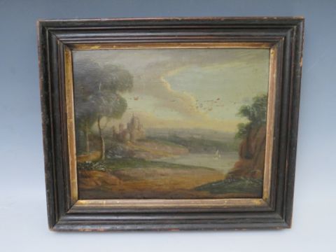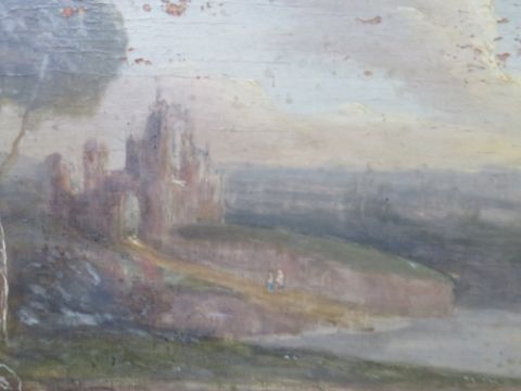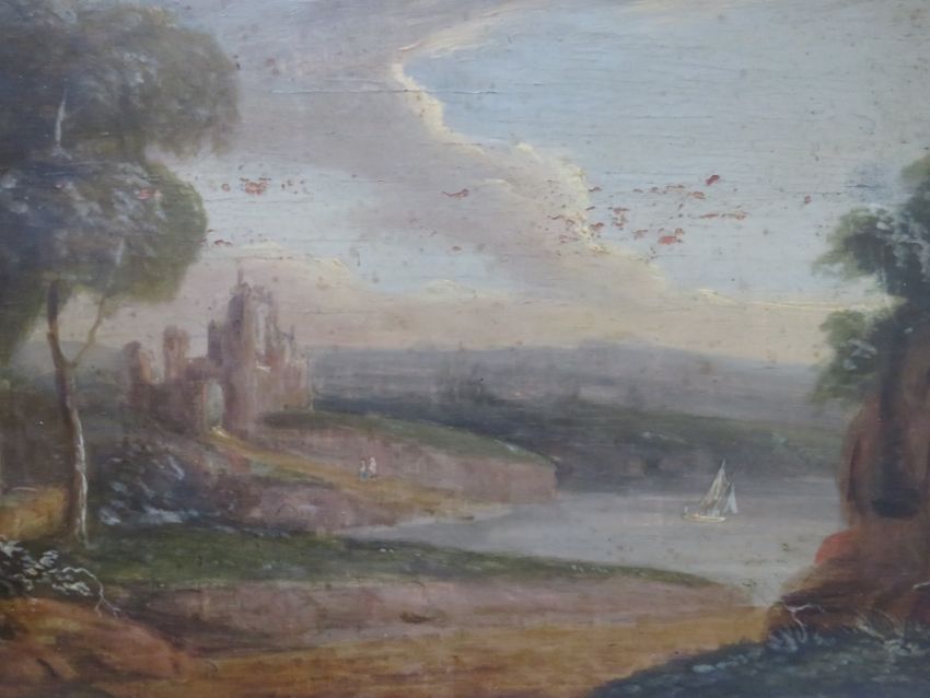 (XVIII). A stormy coastal landscape with abbey ruins, indistinctly inscribed verso, unsigned, oil on panel, framed, 20 x 25 cm