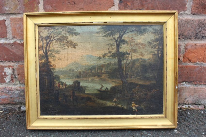 CIRCLE OF PAOLO ANESI (ROME c.1700 - c.1761). An extensive river landscape with fishermen in the foreground, oil on canvas, gilt framed, 30 x 41.5 cm