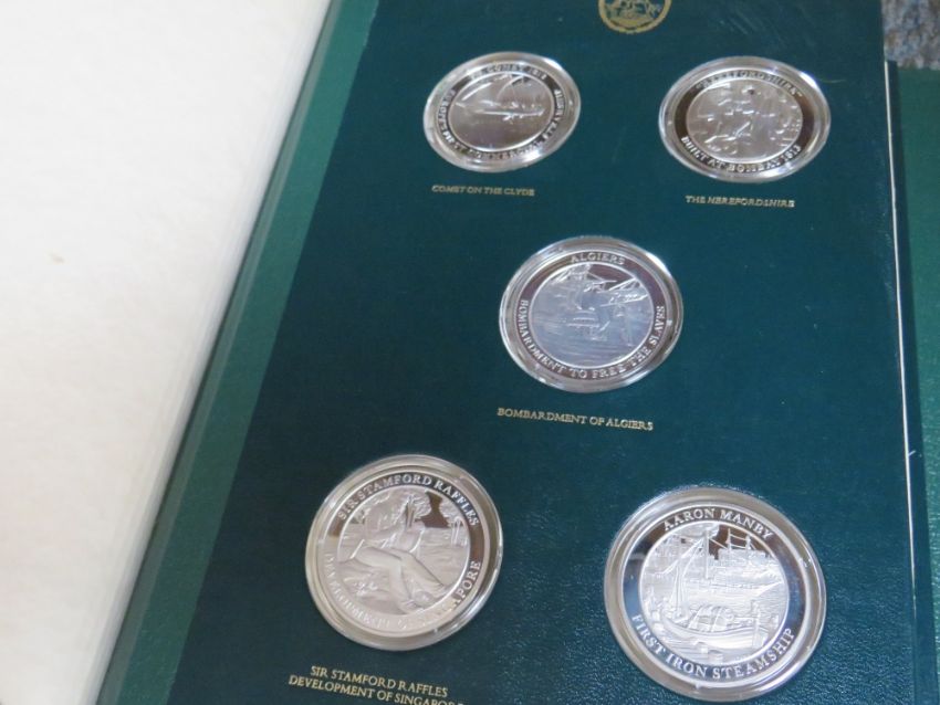 THE MOUNTBATTEN MEDALLIC HISTORY OF GREAT BRITAIN & THE SEA LIMITED EDITION SET OF FOUR EMBOSSED BOUND VOLUMES OF STERLING SILVER PROOF EDITION COINS / MEDALS NUMBER 1403 ON CERTIFICATE BY JOHN PINCHES, CONSISTING OF 100 PIECES ALL HALLMARKED TO THE EDGE