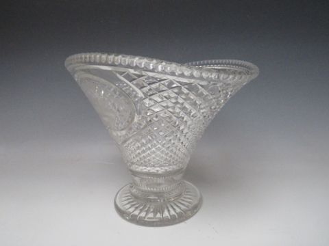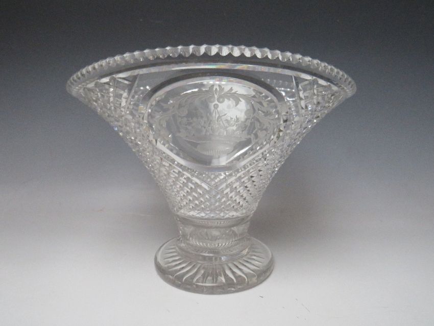 A HOBNAIL CUT GLASS VASE OF LARGE PROPORTIONS, of flared form with engraved embellishment to cartouche each side, raised on a circular flash cut base H 24.5 cm
