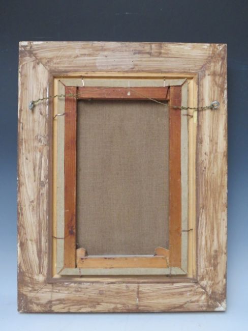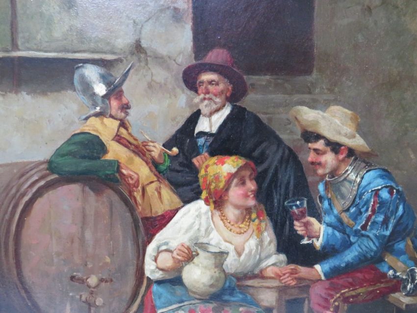 (XIX). Continental school, an inn interior scene with figures, signed lower left, oil on canvas, framed, 38 x 26 cm