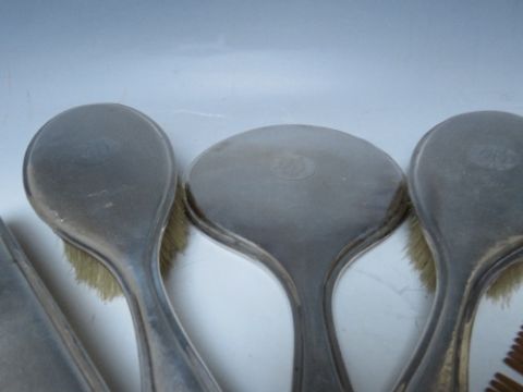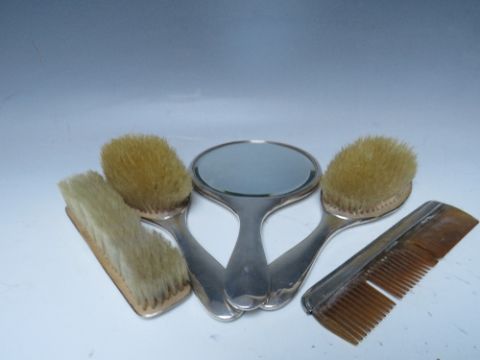 A FIVE PIECE HALLMARKED SILVER BACKED DRESSING TABLE SET, with engraved date and initial to cartouche