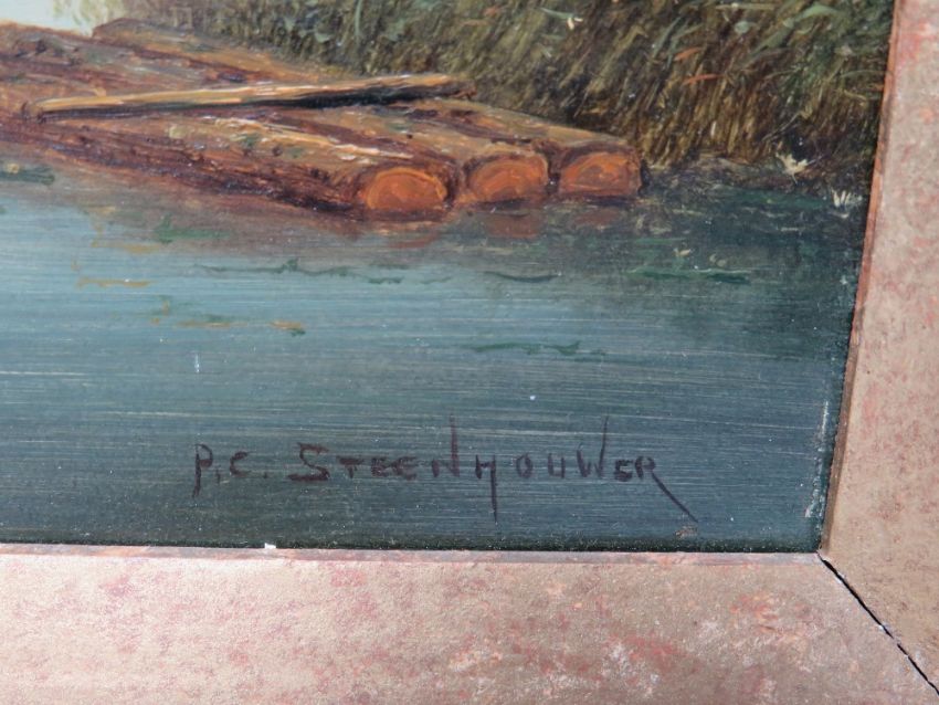 PIETER C. STEENHOUWER (1896-1972). Dutch school, river landscape with boats, figures & buildings, church in background, signed lower right, oil on panel, framed, 28 x 38 cm