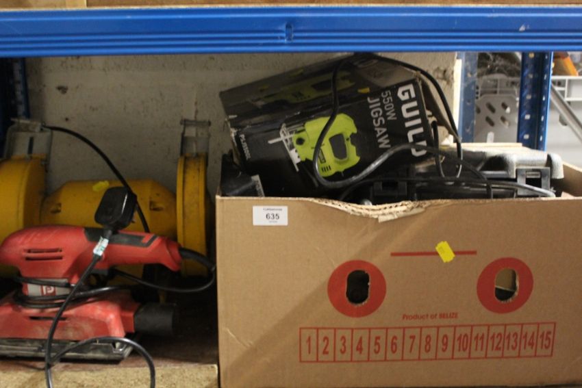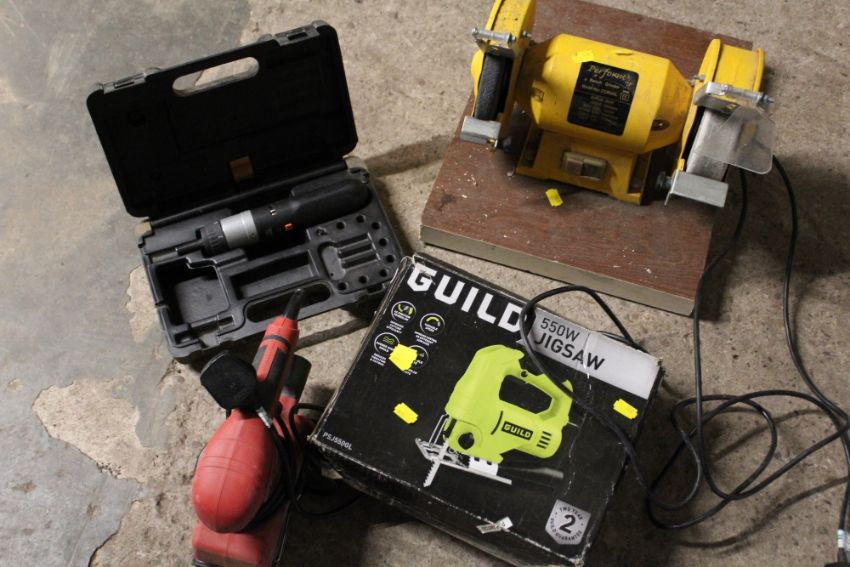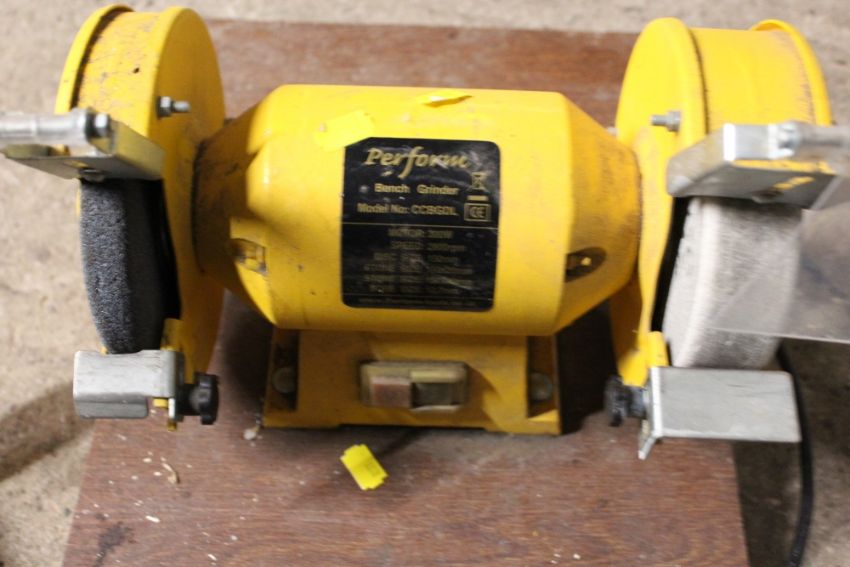 A BENCH GRINDER, PLANER AND BOX OF ASSORTED TOOLS