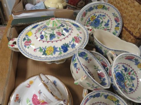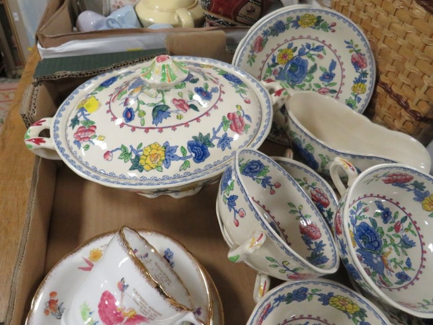 A TRAY OF CERAMICS TO INCLUDE MASON'S REGENCY, DOULTON BUNNYKINS, ETC