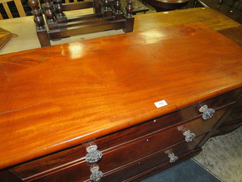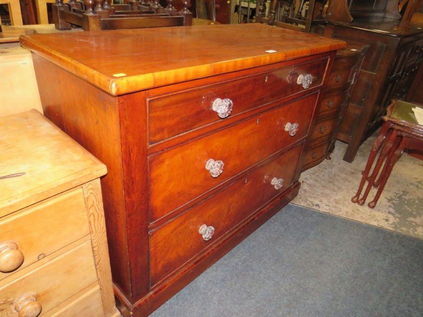 A LARGE VICTORIAN MAHOGANY THREE DRAWER CHEST WITH GLASS HANDLES W-114 CM