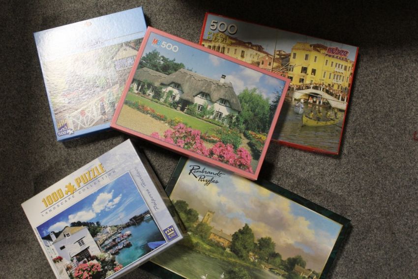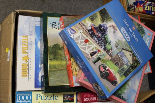 A LARGE BOX OF JIGSAW PUZZLES ETC