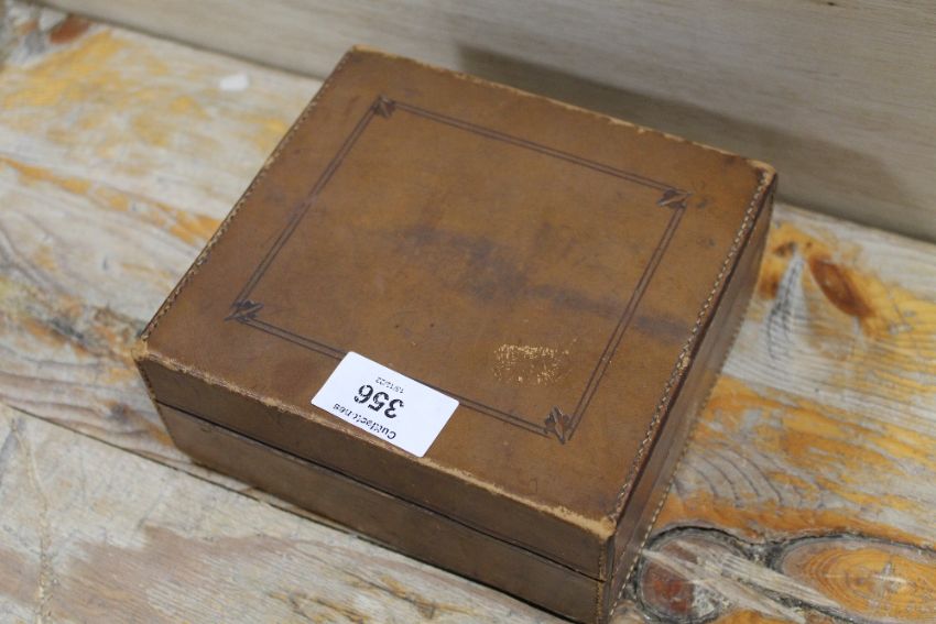 A LEATHER BOUND BOX CONTAINING A SMALL QUANTITY OF COINAGE ETC
