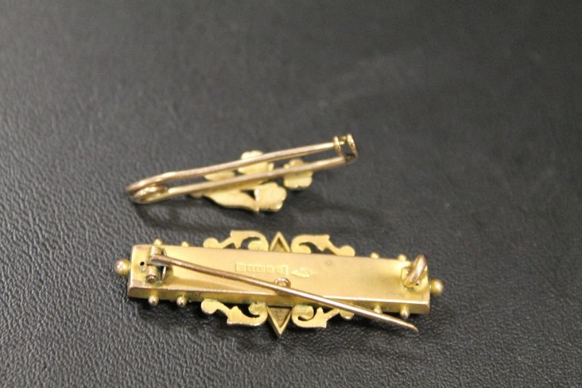 A CHESTER HALLMARKED 9CT GOLD SAPPHIRE AND SEED PEARL BROOCH - APPROX WEIGHT 3.2 g TOGETHER WITH A SMALLER UNMARKED EXAMPLE (2)