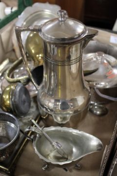 A TRAY OF SILVER PLATED WARE ETC TO INC A BRASS MIDDLE EASTERN STYLE COFFEE POT