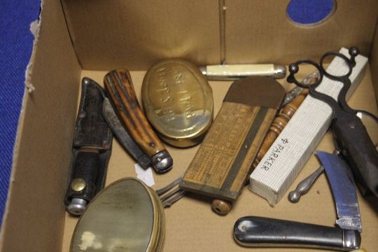 A BOX OF COLLECTABLES TO INCLUDE PEN KNIVES, CORKSCREWS ETC