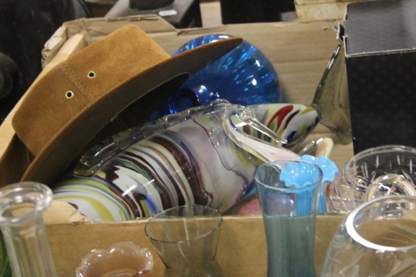 TWO TRAYS CONTAINING MAINLY GLASS ITEMS TO INCLUDE COLOURED EXAMPLES LARGE MURANO GLASS DISH (TRAYS NOT INCLUDED)
